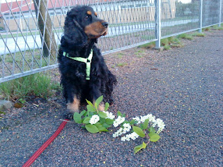 Fajsty poserar jämte bevis på vår och sommar. Men det haglade nyss.