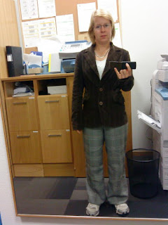 Halleluja. Nya byxor – med gympaskor men ska byta till svarta. Ska klippa av dem och lägga upp dem så att de passar mina skor med klack.